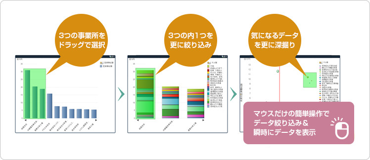直感的に見たい切り口でデータを深堀りする ドリルダウン機能 により分析操作の自由度を高め、分析にかかる時間を大幅に短縮できます。